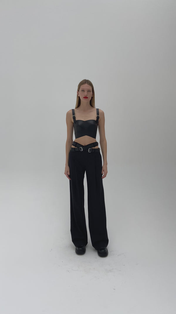 Buckle up. The MONSE Leather Belt Bustier is a tight fitting, tank style leather top. It features a sweetheart neckline, a center back zipper, and finished with belted leather straps and crisscross stitch detailing throughout. Pair yours with the MONSE Criss Cross Trousers.