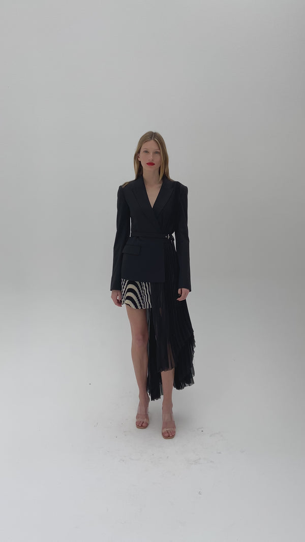 Power blazer. The MONSE Belted Pleat Inset Jacket is a structured jacket with peak lapels and belted waist for added dimension and shape. Designed with an asymmetrical pleated chiffon drape for a slightly more romantic feel. Finish the look with the MONSE Stripe Pleated Skirt.