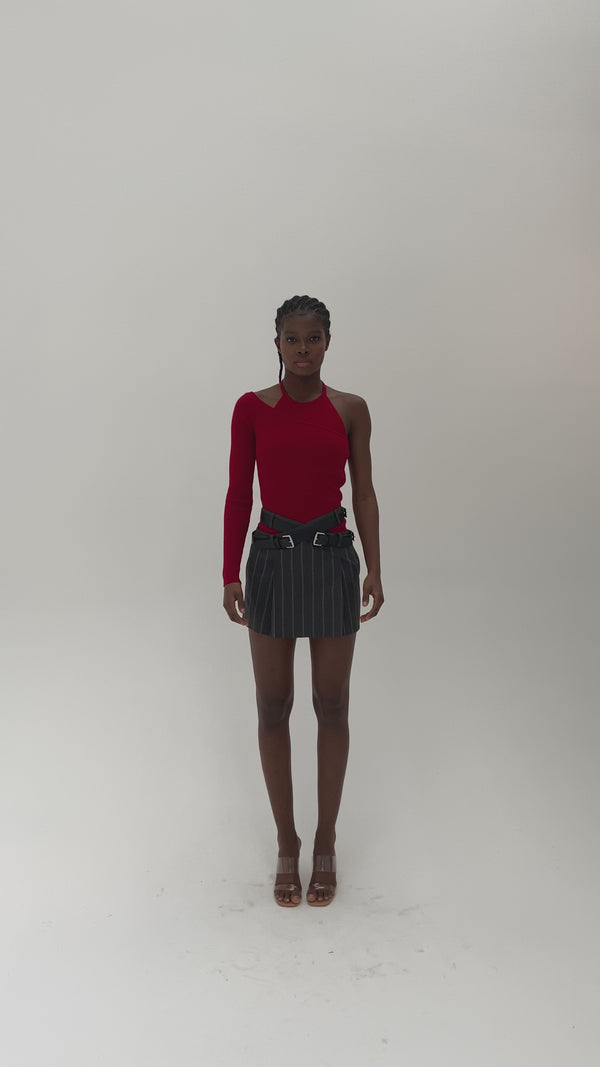 Show some leg. The MONSE Crisscross Waist Belted Mini Skirt is designed for a fitted silhouette from a dotted stripe wool. This style features a criss cross cutout waistband and double belt. Pair yours with our MONSE One Sleeve Halter Top.