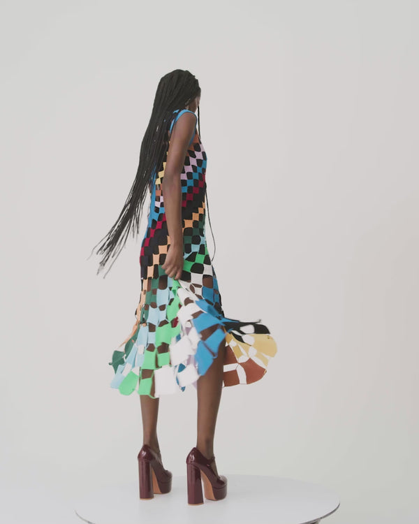 The MONSE Multi Square Crochet Dress is a relaxed fit crochet dress overlay with a fitted black lining. As a midi length, the dress errs on the side of elegance but with a MONSE twist in the form of rainbow crochet squares.
