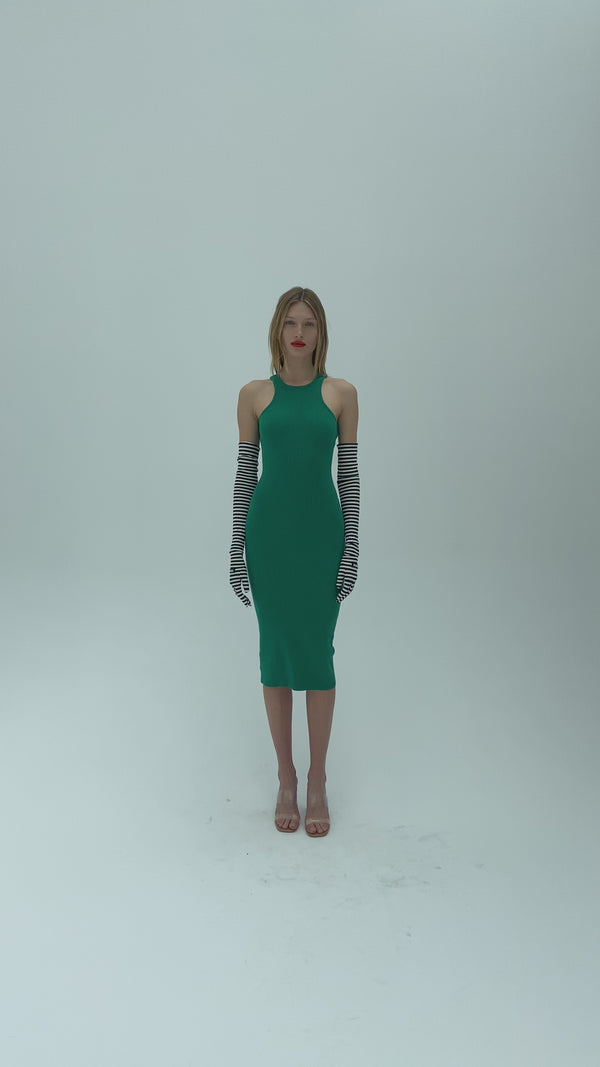 In case of weekends. The MONSE Racerback Knit Dress is a midi length form fitting dress that features an open back with a single strap for a slightly more playful look.