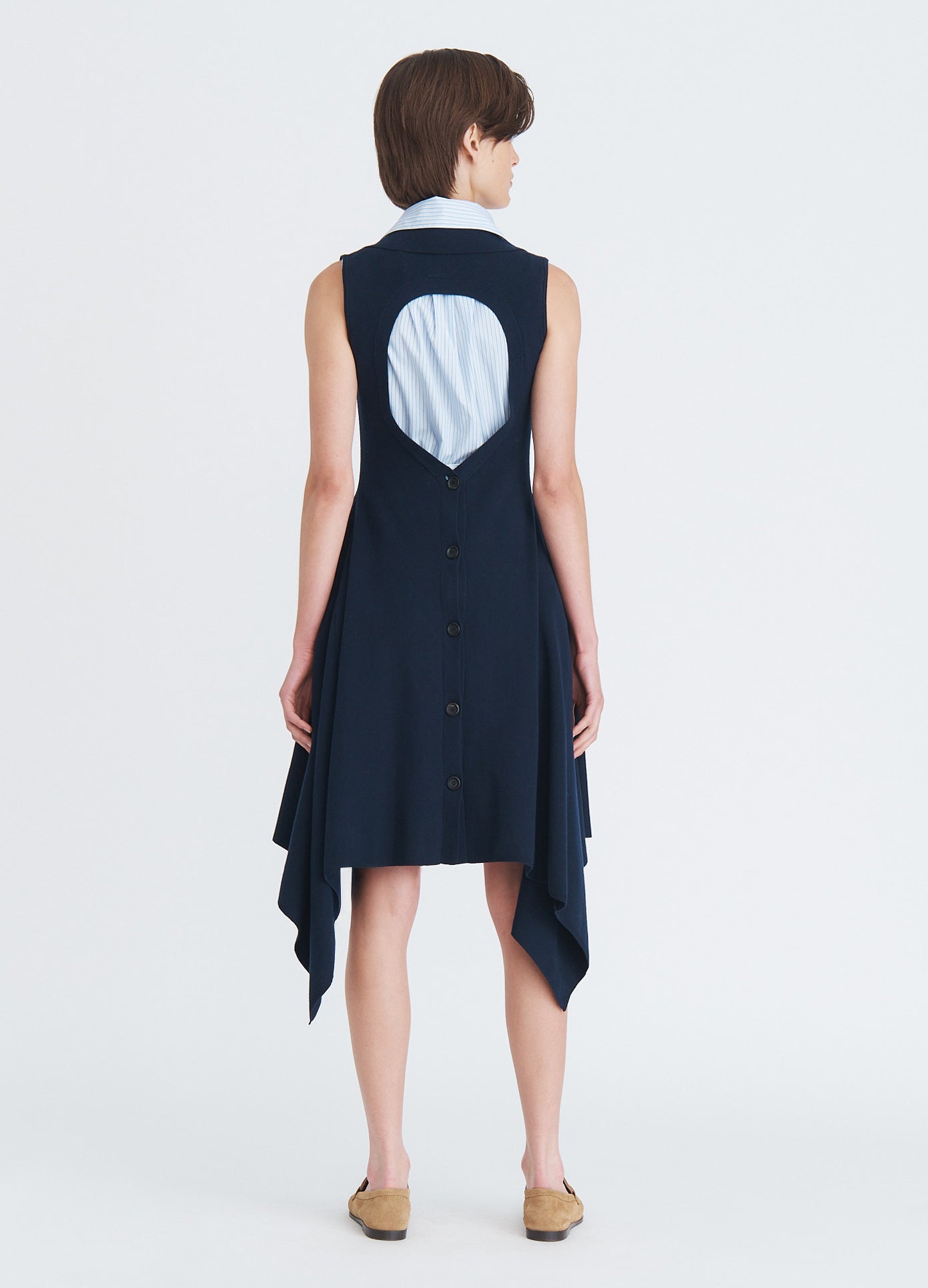 | Product Detail: | A sleeveless knit top with a tailored point collar and plunging V neckline. The back features a bold oval cutout and full button-down closure for added structure and visual interest. The handkerchief hem drapes fluidly, creating movement and a sense of edge from every angle. |